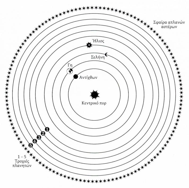Ο Αριστοτέλης αποδίδει στους Πυθαγόρειους ένα αστρονομικό σύστημα, σύμφωνα με το οποίο η Γη, οι πλανήτες και η σφαίρα των απλανών αστέρων περιστρέφονται γύρω από το κεντρικό Πυρ. Επειδή όμως τα περιστρεφόμενα σώματα ήταν 9, θέλοντας να εισαγάγουν στον κόσμο τον αριθμό 10 (την λεγομένη «τετρακτύ») οι Πυθαγόρειοι αυτοί θεώρησαν ότι υπάρχει και μια δεύτερη Γη, η «ἀντιχθών», που περιστρέφεται και αυτή γύρω από το Πυρ. Οι ειδικοί συμφωνούν ότι εισηγητής αυτής της θεωρίας ήταν ο Φιλόλαος. Η θεωρία ήταν βεβαίως τολμηρή, αφού απέδιδε κίνηση στη Γη, δεν μπορούσε ωστόσο να εξηγήσει ακόμη και τα πιο γνωστά πλανητικά φαινόμενα. Το πιο πιθανό είναι ότι ο Φιλόλαος δεν είχε έναν τέτοιο σκοπό, αλλά ήθελε να βρει έναν τρόπο για να προσδώσει αρμονία στον ουρανό. Με την ύπαρξη του 10, που αποτελεί το άθροισμα των πρώτων τεσσάρων αριθμών (1+2+3+4), ο κόσμος αποκτούσε αρμονική μουσική δομή: οι λόγοι 1/2, 2/3 και 3/4, που ήταν το θεμέλιο της μουσικής θεωρίας των Πυθαγορείων, ενυπήρχαν πλέον και στον ουρανό. Παρόμοια θεώρηση του σύμπαντος προδίδει και η περίφημη πυθαγόρεια «αρμονία των σφαιρών», η ύπαρξη δηλαδή μιας ουράνιας μουσικής, που παράγουν οι πλανήτες και οι αστέρες καθώς κινούνται, μια μουσική την οποία όμως μόνο οι μυημένοι μπορούν να ακούσουν. Δεν αποκλείεται η γοητευτική αυτή θεωρία, που αποδείχθηκε ιδιαίτερα ανθεκτική στο πέρασμα του χρόνου, να αναπτύχθηκε και αυτή από τον Φιλόλαο.